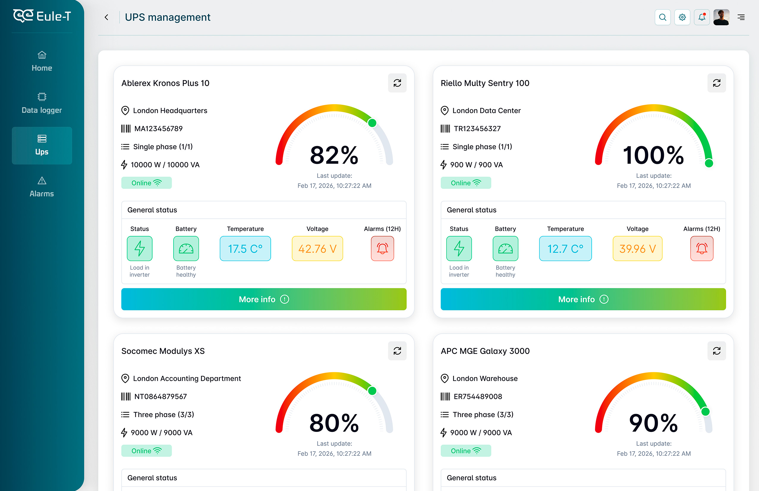 Eule-T brings together all the information from your UPS and IIoT devices in a single dashboard, regardless of brand, model or location. You can monitor system status, receive alerts and manage interventions from a single intuitive platform. No more separate tools, multiple screens or proprietary software: everything is centralised, organised and immediately accessible.